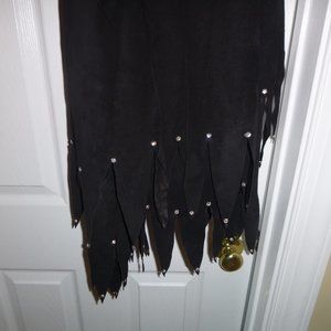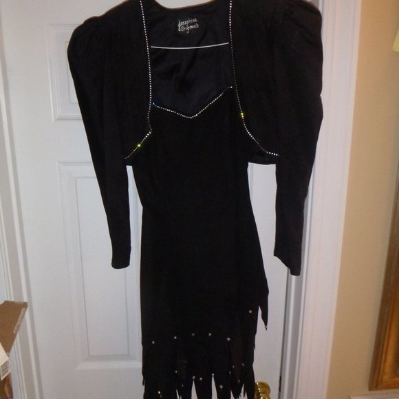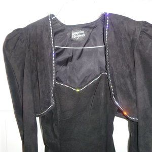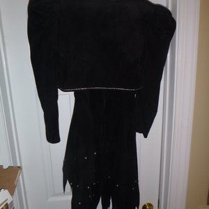 This is a one of a kind big 1980's leather suede dress. It would fit someone between the height of 5' to 5' 6", I would consider it size Small. The shoulder pads in the removable jacket are quite puffy. I don't think it was worn more than once ore twice, been in storage for the past 30+ years.