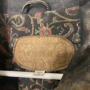Preowned. Has wash wear throughout. Was made with some distressing but also signs of wear. There is an area of discoloration as shown in the last pictures but hard to see due to the color of the jacket. Barely noticeable.