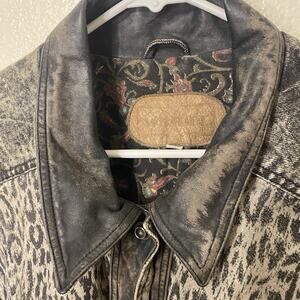 Vintage 1980's Acid Wash Leopard Print & Leather Denim Bomber Jacket Size Small