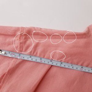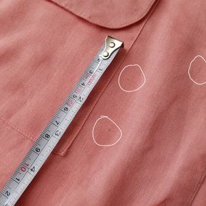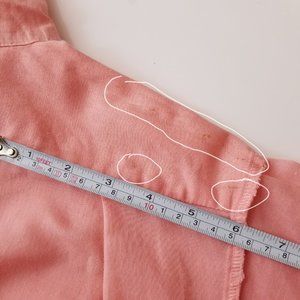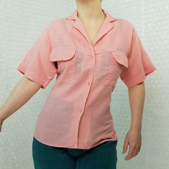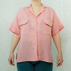 Vintage 1980s Album by Kenzo salmon pink button-up top. 3 button front closure. 2 bust pockets. fabric has no stretch. some minor staining, not noticeable when worn.