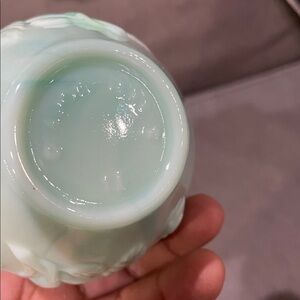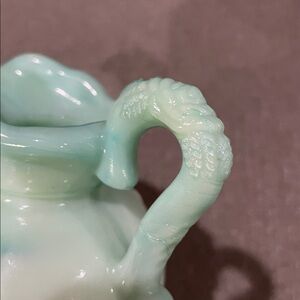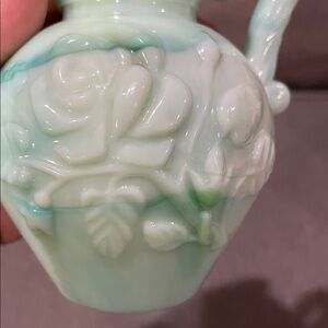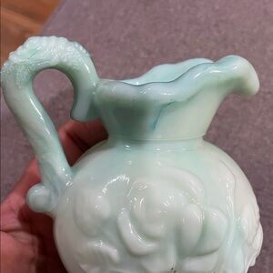 It is a blue green marbling coloring. There is a flower Imprint on the handle, as well as on both sides of the pitcher.