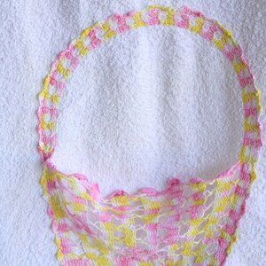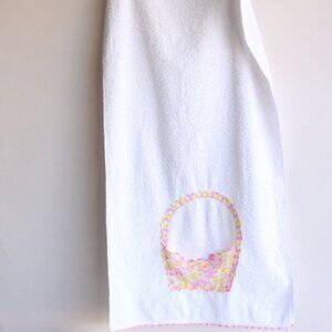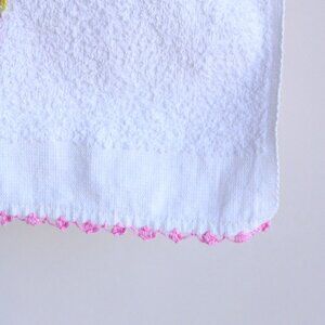 Charming vintage terrycloth hand towel in white circa the 1980s. Has pretty pink and yellow crochet pocket in the shape of a flower basket at one end. Decorative end has scalloped crochet trim. Label reads: Cone, Made in USA. Measures approx. 38" x 21.5". Excellent vintage condition.
