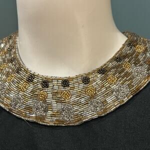 Elegant vintage black dress from the 1980s by Clair de Lune. This sophisticated evening gown features a relaxed blouson bodice with long sleeves, a drop-waist silhouette, and a beautifully hand-beaded collar in gold, silver, and black. The intricate beadwork creates a built-in statement necklace effect, making this piece perfect for formal occasions, cocktail parties, or collectors of vintage eveningwear.