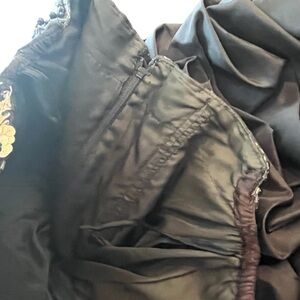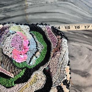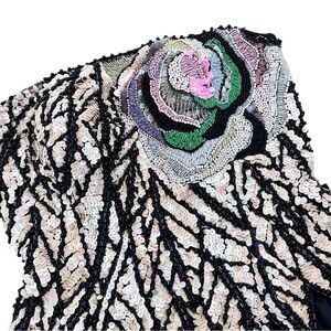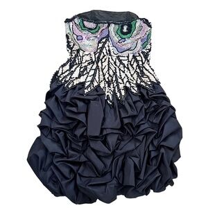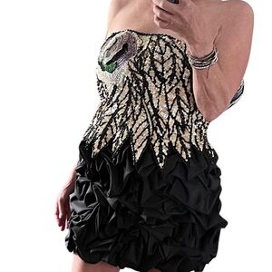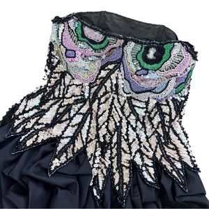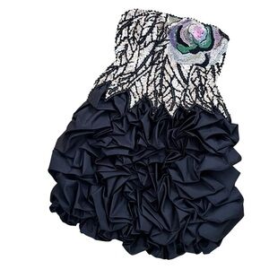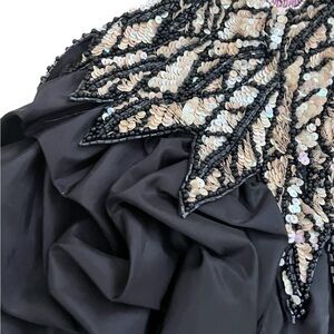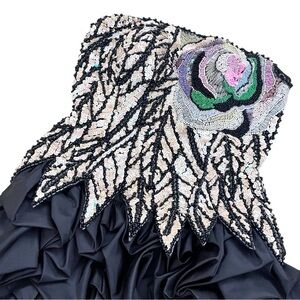 Stunning black dress with intricate folds on bubble hem with exquisite sequin design. Features elegant ruffles for a dramatic look. Perfect for special occasions. This is fashion history. Fully lined and boned with built in bra. Strapless. Amazing sequined flower detail and dimensional waist. No tag. Measures like an extra small.