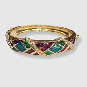 Step into the elegance of the 1980s with this stunning vintage Butler necklace and bangle bracelet set. The set features a striking combination of green, blue, and purple enamel in a geometric design, beautifully accented with gold-tone metal and pave details. This set captures the bold and artistic spirit of the era, making it a standout addition to any jewelry collection.