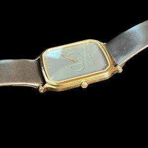 This 1980’s Christian Dior Quartz watch is a very very rare and unique model. Comes with a COA. Gray leather strap embossed with signature, one side is in great condition, the side with the fitting holes has some wear on the leather. See photos. However, once it’s closed/Worn you can hardly see the wear. I had the battery replaced on 8/23/24 at my local jewelers.