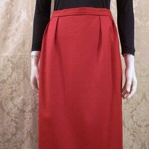 This vintage 1980's Christian Dior red wool skirt is a classic that will never go out of style. It's a straight skirt with four inverted pleats at the waist and two darts in the back to ensure an excellent fit. The best thing about it? It has pockets! It has a center back zipper and button closure and a 9" kick pleat for ease when walking and sitting. There's no fabric label but it's a very soft wool, possibly with some cashmere in it. Fully lined with matching red fabric. This skirt is a true rich red and it has a lovely sheen to it. Originally this skirt had a matching jacket as the label reads "Christian Dior - The Suit - Paris - London". The lining has a bit of unraveling near the slit but other than that it's in excellent condition.