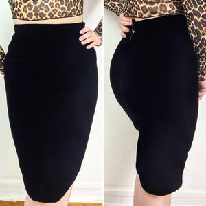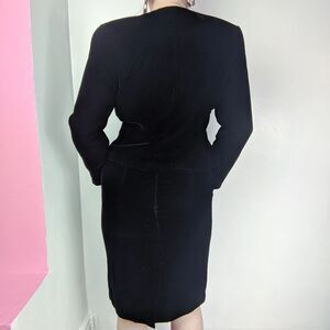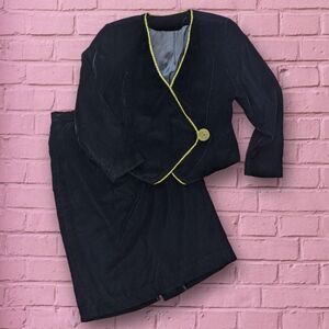 Va Va Voom! Say hello to this stunning, sexy 80s black velvet skirt suit from Talbots. Very simplistic, and tailored fit. The jet black velvet is super soft. And has a simple gold trim on the blazer fastened with an oversized button. The blazer has lightly padded shoulders. Tagged size 8 petite. I would say that the blazer fits true, but the skirt runs smaller. This set would work well for size small waist and S/M top. Model is 5'3 size S/M (27in waist). I was not able to zip the skirt all the way. Please see measurements for details. PM me if you have any questions.