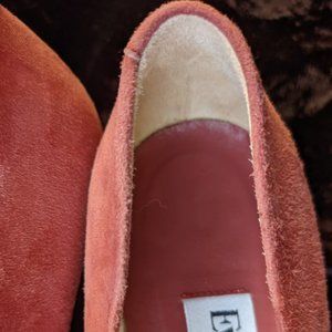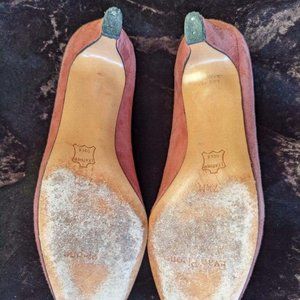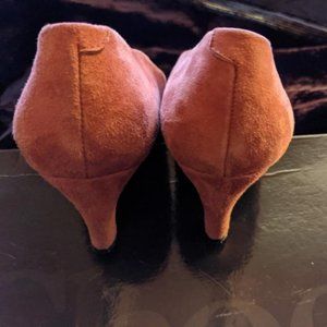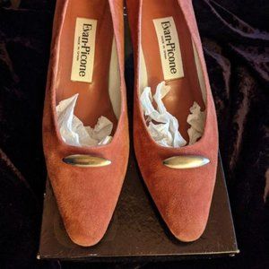 New beginning shoes by Evan-Picone; iconic for the era. Awesome 1980s vintage Evan-Picone suede pumps with great mod atomic shape pewter accent beads and 2-1/4" heels. Single owner, light professional wear. Beautiful condition! Lovely suede in a soft pinky reddish natural warm color, they are described on the end of the original shoe box as "Rosewood Sde / Pewter." Original box, paper liner, and Nordstrom sticker, these WOW! vintage heels are gently worn, near perfect. The soles show light wear underneath; the interiors are clean, like new, with pristine rims; the exterior suede is soft and clean. The camera picked up a tiny reflection spot on the left front of the toe box that is not visible when worn. Made in Spain. Top quality. A great opportunity to own a classic designer shoe in an *ah-mazing* color.
