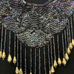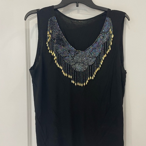 Elegant black sleeveless top featuring intricate embellishments. Perfect for adding a touch of glamour to any outfit.