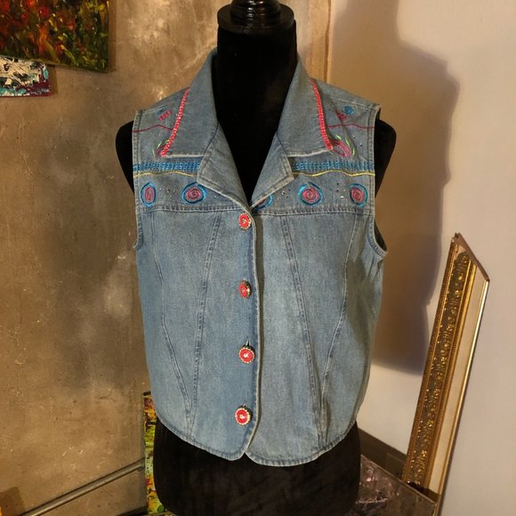 Light weight denim collared vest with colorful designs and rhinestones. Enamel decorative buttons.