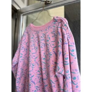 Vintage 1980's pink crewneck pullover sweatshirt from First Run with blue/green paisley and feather pattern all over. There are buttons on the top left shoulder. There are no major stains, holes, or tears. There is no size tag, but it fits a size medium. Please check measurements before purchasing!