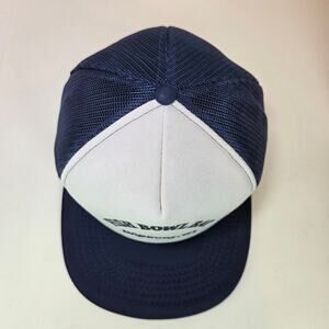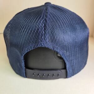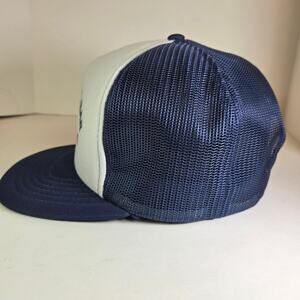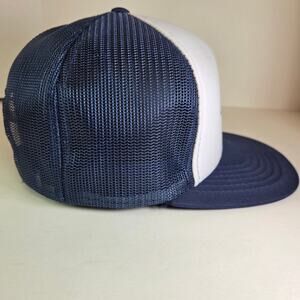 This vintage Fish Bowl Bar trucker hat comes from Danbury, Wisconsin and features a bold navy and white design. Made in Korea by YoungAn, it has a foam front panel with navy mesh backing and an adjustable snapback closure. A classic example of 1980s bar and tavern promo merchandise, this rare regional hat is a must-have for collectors of vintage trucker caps.