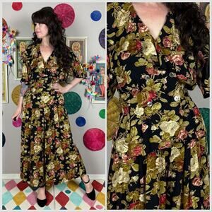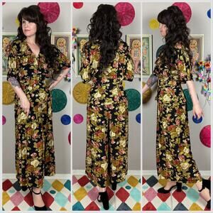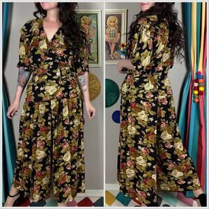 An adorable 80s set! Comes with a double breasted buttoned blouse with short puffy sleeves and a cascading ruffled neckline. Plus, a pair of high waisted pleated, wide leg, cropped palazzo pants that have a flat waist in front and some elastic in back. They also zip in back and have no pockets. Comes in black with an autumnal sage green, mauve and beige floral print. Made from a lighter weight, flowy, crinkle rayon material.
