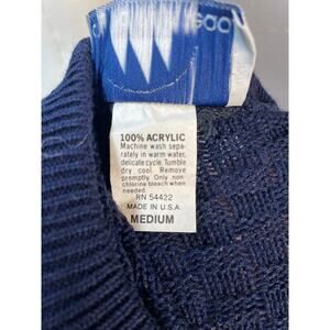 Navy blue acrylic knitted into a square waffle knit pattern in the back and on the sleeves .