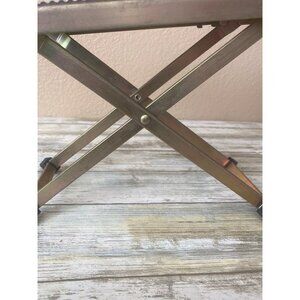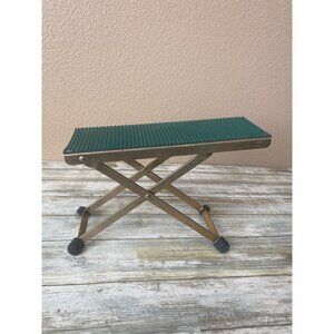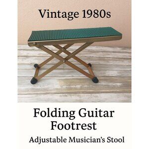 Add a touch of vintage charm to your music setup with this vintage 1980s folding guitar footrest. Made with a sturdy metal X-frame and a ribbed green rubber top, this adjustable foot stool is perfect for classical guitarists, musicians, or anyone looking for a compact portable footrest.