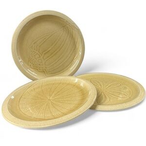 Bring coastal elegance to your dining table with this set of 3 vintage Franciscan dinner plates from the Sand Dollar collection. Each plate showcases a unique embossed sea life design, including a sand dollar, sea urchin, and cocoa pod motif, in a warm speckled beige glaze.