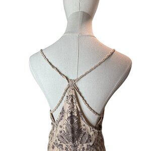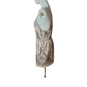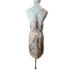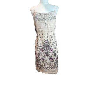 Beautiful Free People Vintage 1980s mini dress featuring a soft ivory base with a charcoal bohemian floral print and delicate crochet lace detailing at the neckline. Intricate beaded embellishments in shades of plum and silver add a feminine touch, while the braided racerback straps and partial button-front bodice create that effortless, carefree Free People aesthetic. Elastic waistline for comfortable fit. Lightweight woven cotton-linen blend fabric perfect for summer festivals, concerts, or layering under a denim jacket. Some of the beading is missing existing beads have been hand sewn to secure.