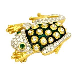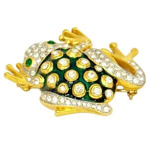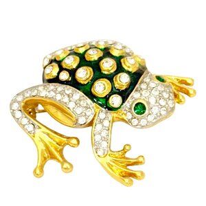 Cute 1980s frog brooch/pin. Very nice quality crystals and metallic green enamel with gold tone accents. Measures approx. 2" x 1.5". Very good overall vintage condition. Unsigned.