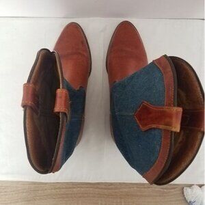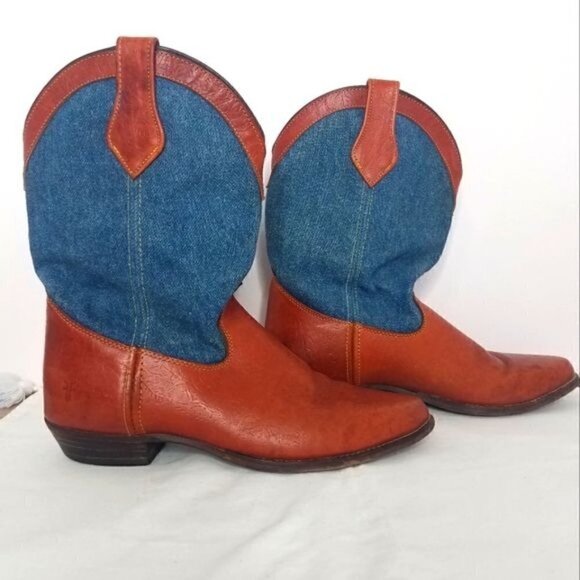 Vintage 1980s Frye Denim and Tooled cognac Leather Western Boot 8