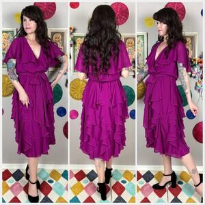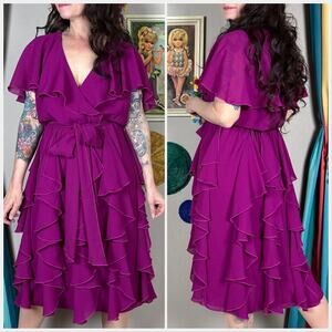 You'll be effortlessly elegant looking in this 80s stunner! Featuring a sleeveless surplice bodice with an oversized cape-like ruffle collar that creates short sleeves, plunging v-neckline, elastic waist and fluttery oversized ruffles that cascade down the skirt giving it some whimsical drama. Comes with a matching sash belt that ties. Slips on. Made from a crepe chiffon polyester material. Dark fuchsia, berry color.