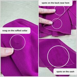 Overall in very good condition with a few minor flaws. Besides the elastic issue noted above, there's a small snag on the collar and some spots both on the back of the dress near them hem and on the sash belt. All shown in photos