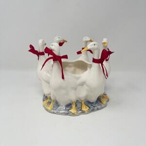Vintage 1980s Gaggle of Geese Round Small Ceramic Planter w/Red Ribbon Bows