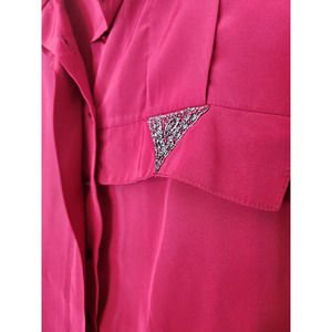 Vintage Gailord Made in the USA button up dress shirt in a Women's size 12. Good pre-owned condition. 100% Polyester. Color is showing a bit more red in the photos, but it is more of a darker pink, magenta type color. Very cute triangle detail and some pleating at the shoulder. From a smoke free environment. Shirt does have shoulder pads that could easily be removed.