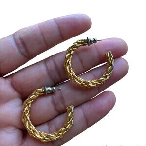 Love these! Gold tone rope hoop earrings from the 80’s. Good vintage condition. Some patina as shown. Pierced post backings. This style hoops were very popular in the mid - late 80s.