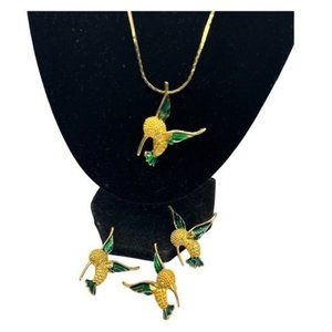 Vintage 1980s Gold Tone Hummingbird Pendant Necklace Enamel Wings & Rhinestones