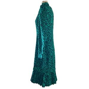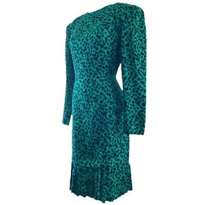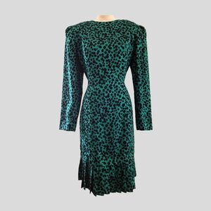 Elegant and timeless, this vintage 1980s dress features a green and black polka dot print on luxurious pure silk. Designed with long sleeves, a pleated skirt, and classic mid-length silhouette, its the perfect blend of retro sophistication and feminine charm. Ideal for special occasions or styling with boots for a chic vintage look.