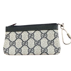 Very good condition vintage 1980’s Gucci key case. Navy leather trim, zip top, navy logo on cream background, silver key holder. Outside perfect, inside has abrasion to the leather lining from the keychain . Won’t affect wear , noted for reference. Please see all photos for details.