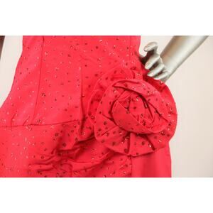 Vintage 1980s red strapless glitter Gunne Sax Dress. A large rosette at the hip atop a tulip style skirt. The dress is sprinkled red metallic glitter on the front of the garment. Gunne Sax size 11/12. Acetate.
