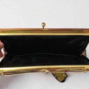 Good condition, vintage look, enhanced with natural ageing hand embroidered fabric that is full intact with all embroidery in place but with an aged vintage look. Frame is in good condition as is the metal strap and inner black lining. Clasps in working order as it was when the purse was new. No pulls and no loose seams. No inner lining issues.