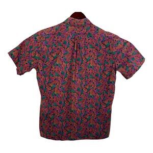 This Vintage 1980s Hilo Hattie Fall Leaves Vibrant Hawaiian Made in USA Large Shirt is a colorful and unique addition to any man's wardrobe. Made of 100% cotton knit fabric with a button-down collar and short sleeves, this shirt is perfect for casual or party occasions. The shirt features a floral pattern in vibrant colors, embodying the Hawaiian theme. With a regular fit and chest size of 47 inches, this shirt is a versatile piece that can be worn in all seasons. The large size and vintage quality make it a rare find for those who appreciate classic Hawaiian style.