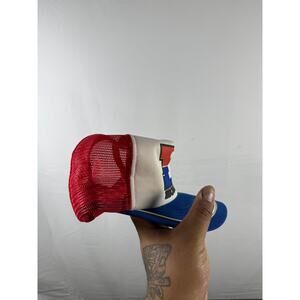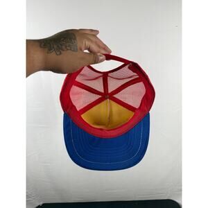 Color: Red mesh back, white foam front, blue brim with cream trim