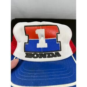Classic vintage Honda Racing trucker hat featuring the bold “#1 Honda” logo in red, white, and blue. This patriotic mesh cap embodies that retro 1980s motocross and powersports style — perfect for collectors, riders, or vintage streetwear fans.
