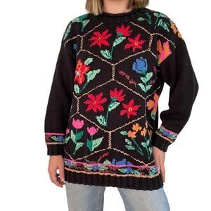 Vintage 1980s Hunt Club Hand Knit Floral Embroidered Oversized Grandma Sweater