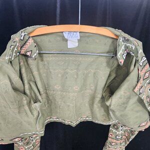 Tribal button Up, Long Sleeve, Cropped Top, with Shoulder Pads. Sage green with off-white, black and pastel pink/peach southwestern print. Metal buttons with matching tribal print as well. Size tag says LGE. I take that as a large. See measurements below.