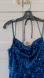 Features: midi length, slightly fitted, tapered, metallic blue, barely there shoestring spaghetti double straps, halter (back) neck tie, straight, column silhouette, zipper close, pencil length, slit, black lining, lightly stretchy, lined, gaudy glam, throwback, retro vibes, 1980s VTG streetwear, formal, evening, shimmer, sparkle, party dress, mob-wife, maximalist vibes, trendy, unique, rare, collectible, everyday femme