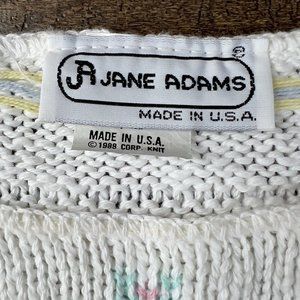 Vintage 1988 Jane Adams Sleeveless Sweater Vest. Listed as size 38 (this is approximately size medium) see pictures for dimensions. New, never worn. There are some areas that appear a bit discolored from age and storage, seller has not attempted to wash due to original tags being attached. 100% Cotton, made in USA.