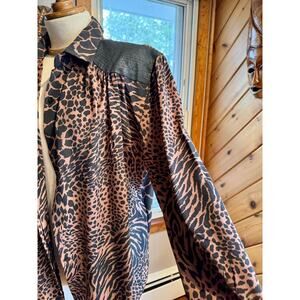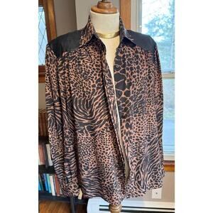Vintage 1980’s Jordan Cheetah print top. Has faux leather shoulder detail. Puff sleeve detail at the shoulder. Size says 13/14. Can fit a Large. A gorgeous vintage item. $32 shipped.