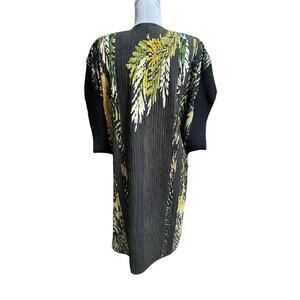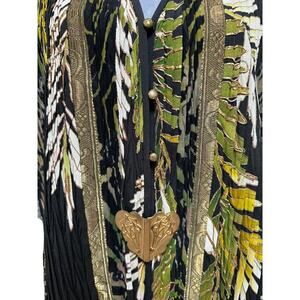 A standout piece from the 1980s Kaneko Los Angeles collection, this vintage art-to-wear kimono jacket is an elegant fusion of texture, pattern, and bold design. It features a dramatic crinkled pleat construction, metallic embroidered ribbon trim, and an ornate heart-shaped gold-tone clasp. The open-front design, bold leaf print, and sculptural silhouette reflect the expressive spirit of 1980s avant-garde fashion.