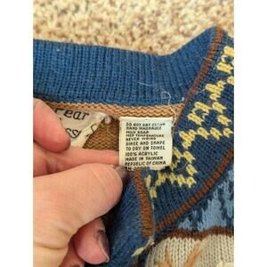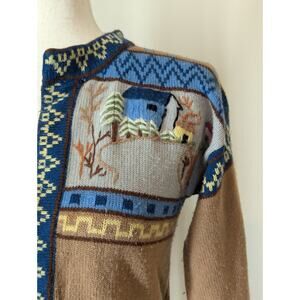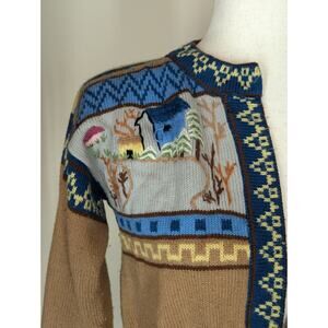 This vintage 1980s knit cardigan sweater in a small size features a brown color with a knit cottage and trees detail, giving it a boho cottagecore style. Made of acrylic material, it has an open front design with a wrap belt for closure. The sweater has a chest size of 32 inches and a shoulder to hem measurement of 26 inches, making it suitable for casual and everyday occasions. The brand is Pear Blossom, and it was manufactured in Taiwan during the 1980s.