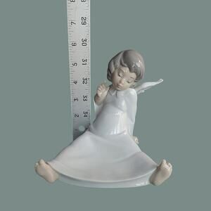 Collectible Llardo porcelain figurine of a seated young angel with wide spread feet, one hand planted behind her, one near her face in a contemplative pose, her head slightly tilted, and her small wings pop out from her long gown. Beautiful condition with no chips or cracks. Made in Spain between 1977 and 1992, stands about 5.5" tall and is about 7.5" from front to back.