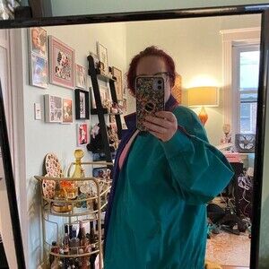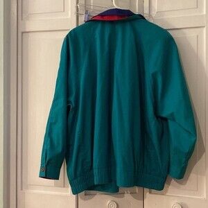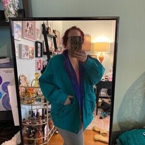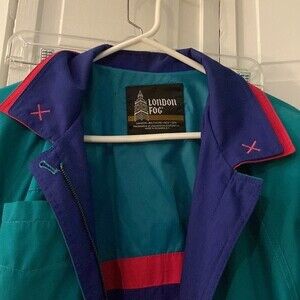 Vintage 1980s London Fog winter jacket. Amazingly teal with purple and pink details. All the pockets. Cute buttons on the sleeve and pockets. Zip closure. Elastic around the waist. This is a special one!