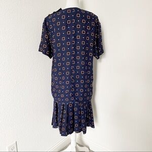 Top is pullover style with short sleeves, a crewneck, and four goldtone button on shoulder. Skirt is pull-on style and has an elasticized waist with a pleated bottom. Navy blue with gold chain square design. Both pieces are in excellent used condition.