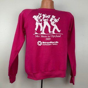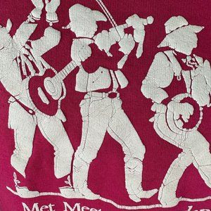 Description - Bright pink raglan crewneck from a Met Meets in Opryland event from 1989. It has a graphic with 3 country music artists playing instruments.
