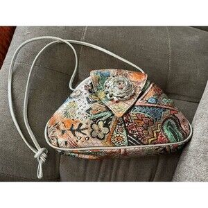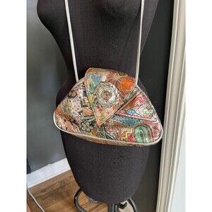 Stunning RARE vintage purse from the 1980’s. It is gorgeous! Metallic embossed and printed leather with hinged opening and super long strap that can betucked inside to make it a clutch. Can be dressed up or down. 10”x 6” the strap is 50” It is gorgeous