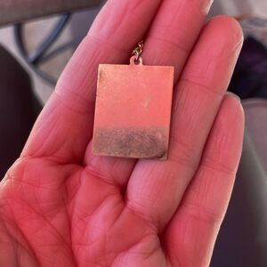 Pendant is approximately 1 x 3/4 of an inch. Chain hangs approximately 9 inches.